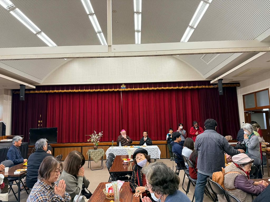 2月8日に『安里教会の祝日』は、私たちは喜びのうちに、那覇教区ウェイン司教様の公式訪問をお迎えました。その日、司教様、主任司祭、そして信徒の皆さんとともに、安里教会のために感謝のミサをささげました。この日にウェイン司教様の公式訪問日として、年に1度、司教様と信徒の交流をもつ機会ともなっています。ミサ後、そのまま聖堂に残り、主任司祭による安里教会の現状報告の後、ホールにてアガペ(Agape)の分かち合いを行いました。